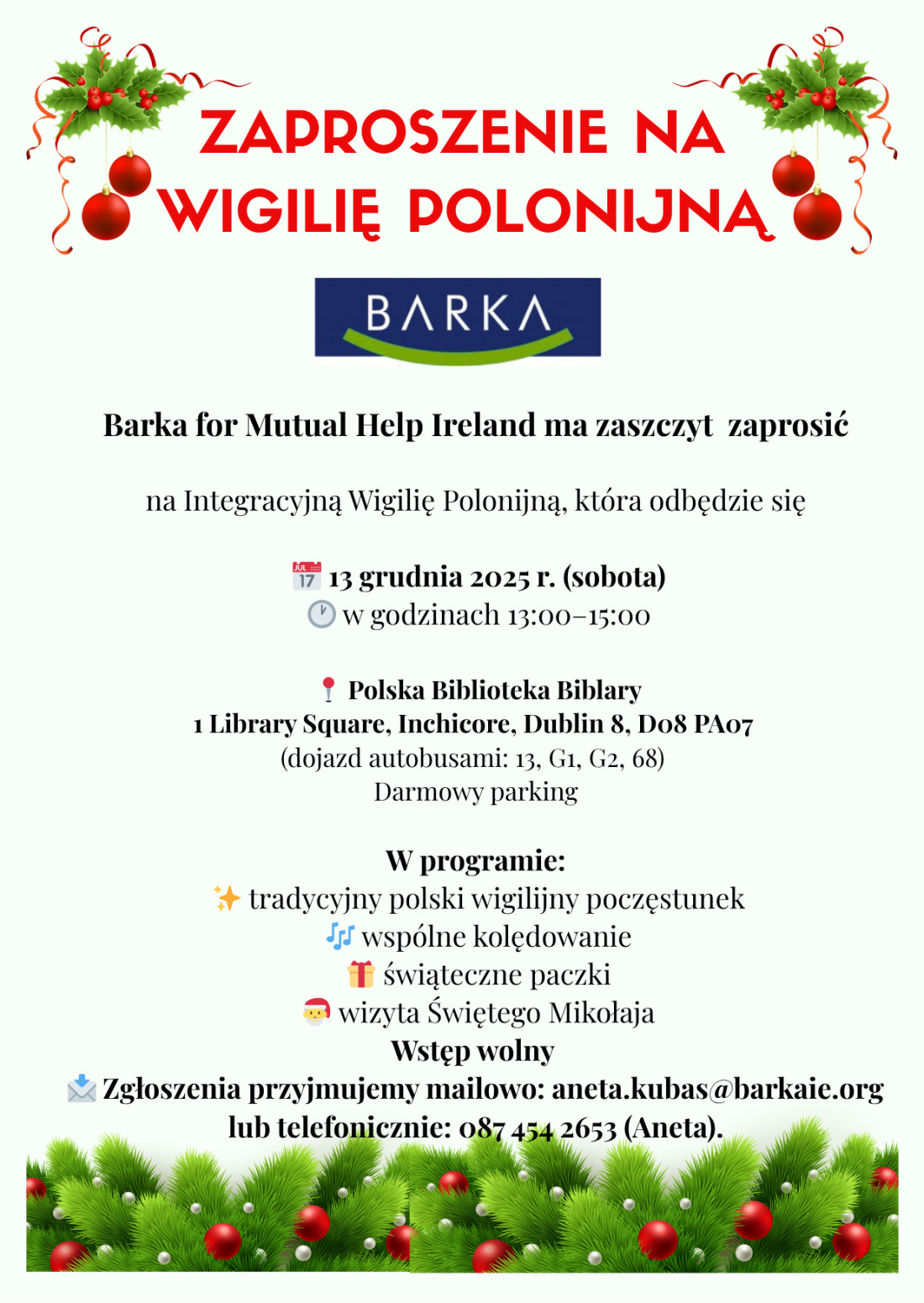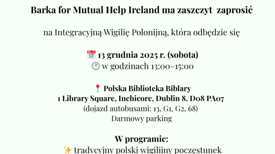 Fundacja Barka serdecznie zaprasza na Wigilię Integracyjną Polonii, która odbędzie się w sobotę, 13 grudnia 2025 roku, w godzinach 1 - 3 pm, w Polskiej Bibliotece Biblary, 1 Library Square, Inchicore, Dublin 8, D08 PA07.